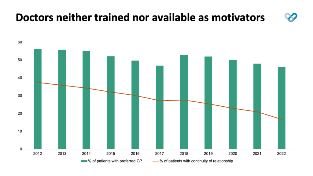 I discussed the irreversible reduction of continuity of relationships. Around 50% of patients prefer a particular GP in their surgery in England. But only 38% of patients got to see the GP they preferred in 2012, and this plummeted to 17% in 2022. We know that continuity of relationship means continuity of care and that means better clinical outcomes. We also know every other trend continues the drop in continuity of relationships.
